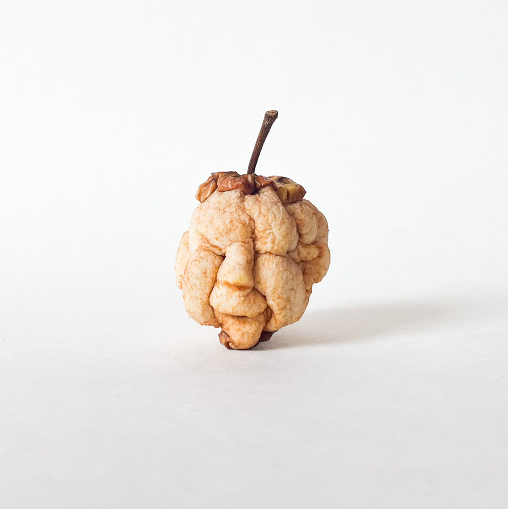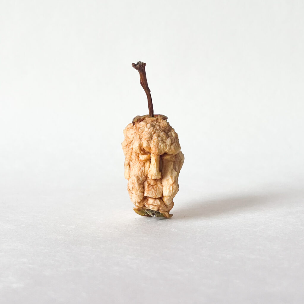 Was normalerweise nach dem Essen übrig bleibt, ist der Apfelbutzen, das Kerngehäuse mit seinen fünf Kammern. Ein Überrest, der oft achtlos entsorgt wird: gefasst am Stiel oder zwischen gespreizten Fingern in hohem Bogen ins Gras, in den Mülleimer oder auf den Kompost geworfen. Doch genau am Apfelbutzen setzt sie mit ihrer künstlerischen Arbeit an, mit einer ganz speziellen Zielsetzung – und entfaltet vor uns ein ganzes Panoptikum.