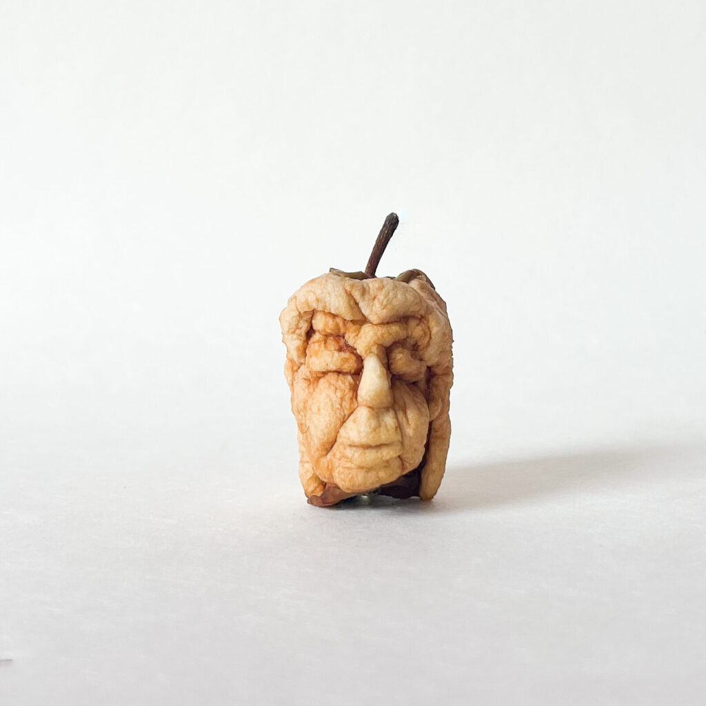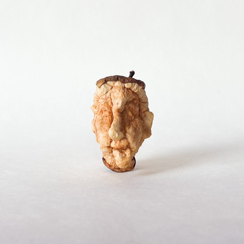 Der Apfel wird geschält, geschnitzt, mit Augen, Ohren und einer Nase versehen, bis ein charakteristischer Kopf entsteht. Zunächst noch glatt und prall, überlässt sie ihn seinem natürlichen Wandel. Das heißt: Zeit und Natur vollenden das Werk.